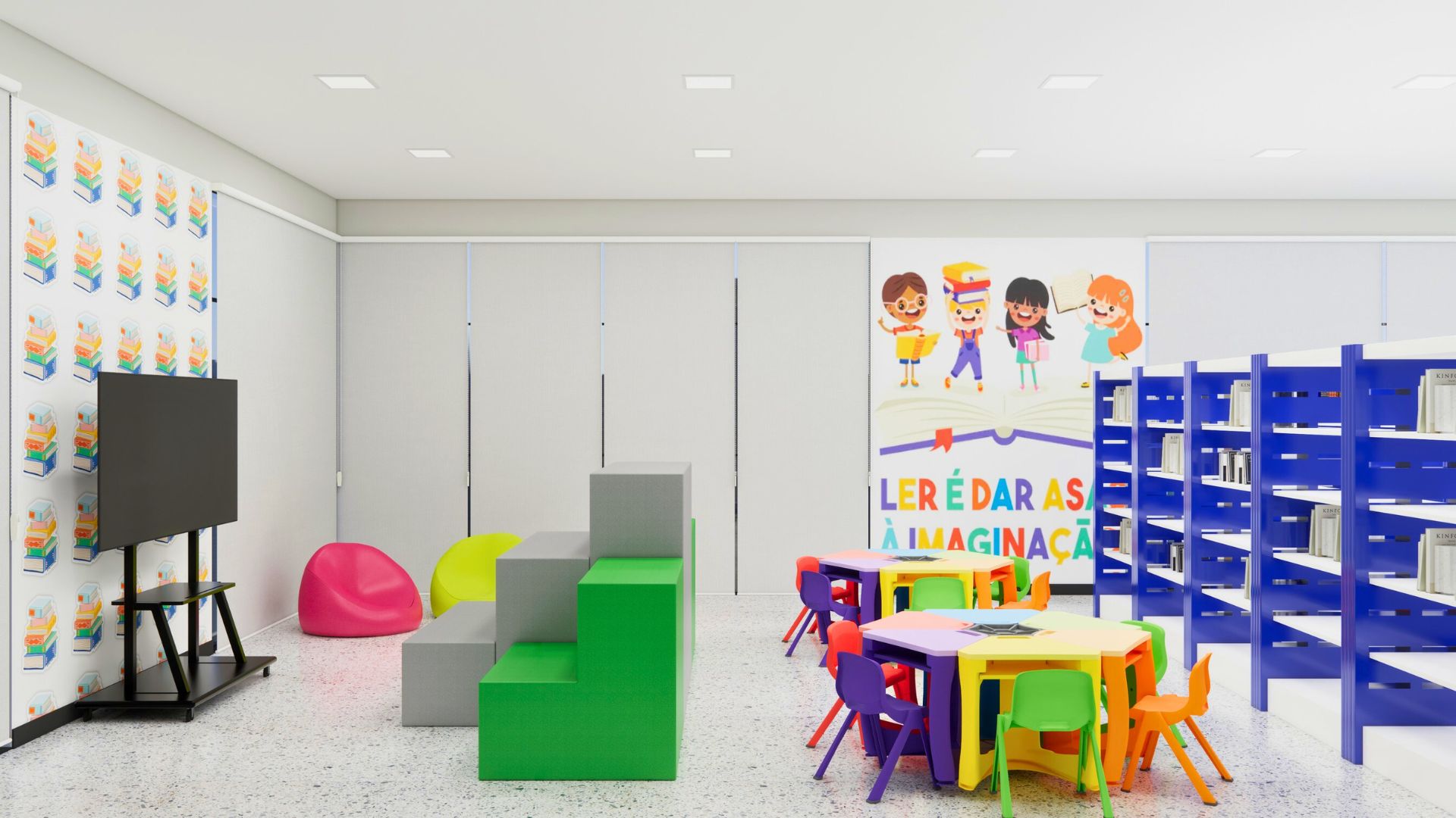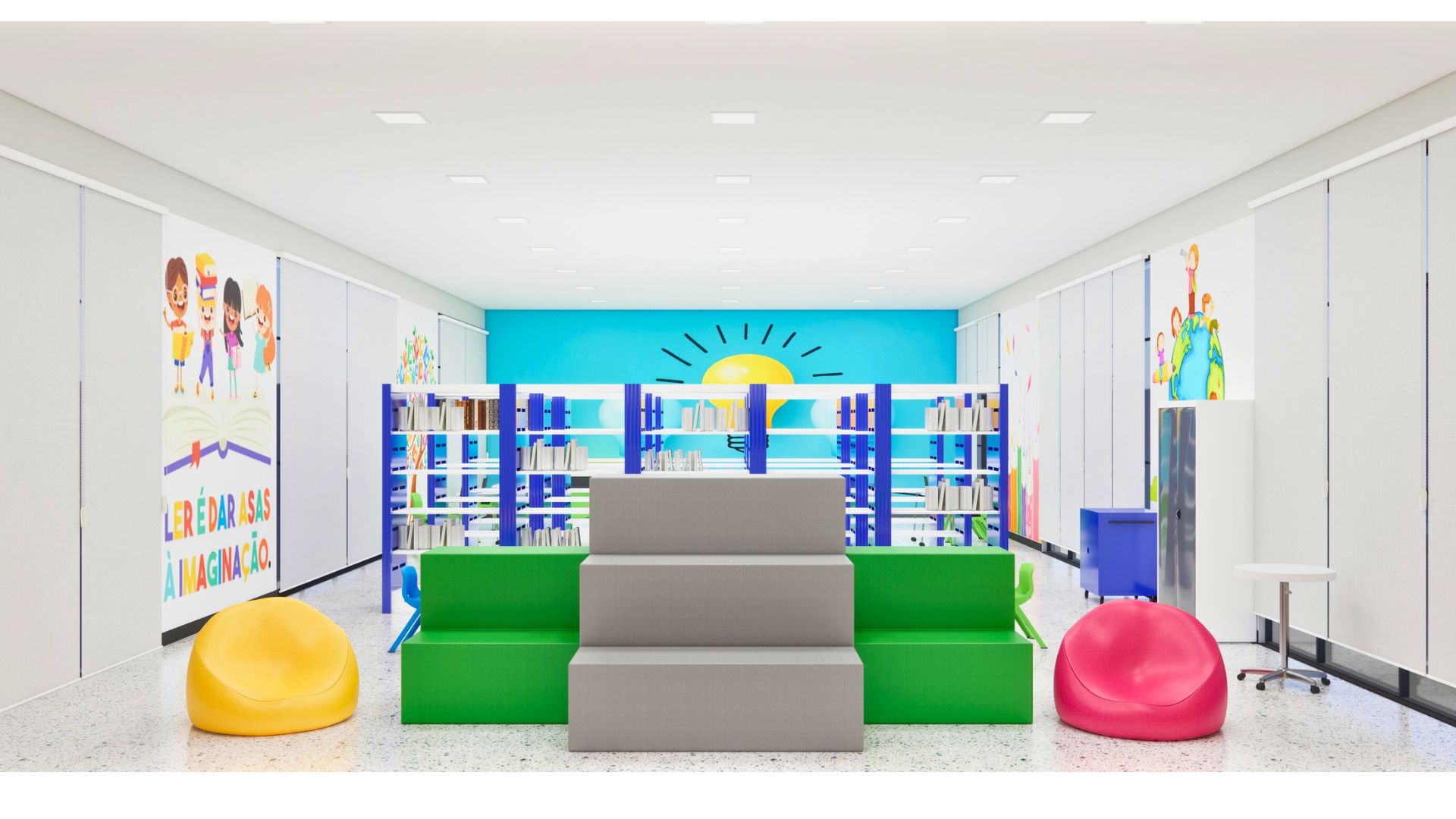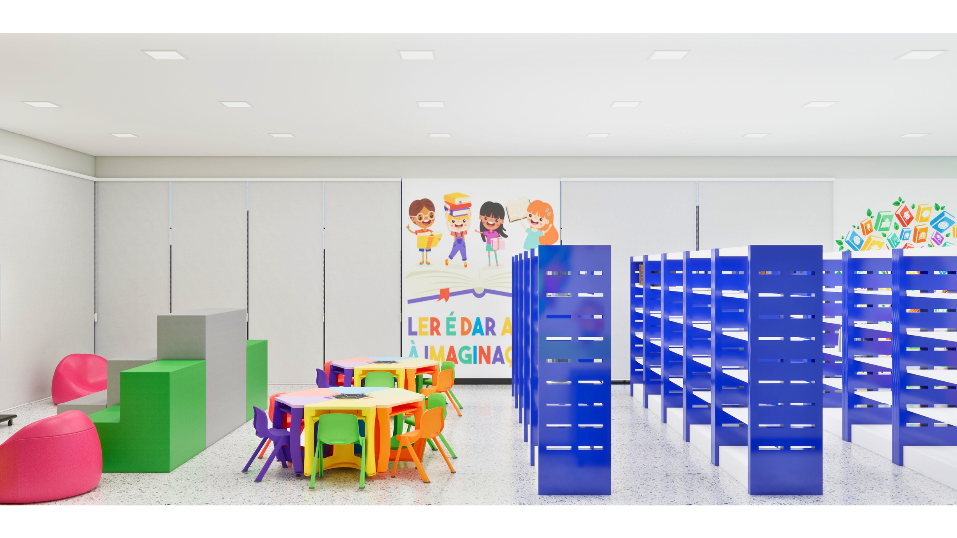 📖 Design Interativo – Áreas de leitura criativas que incentivam a exploração do conhecimento e o engajamento dos alunos.