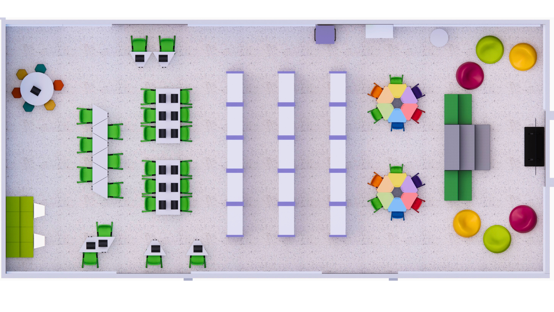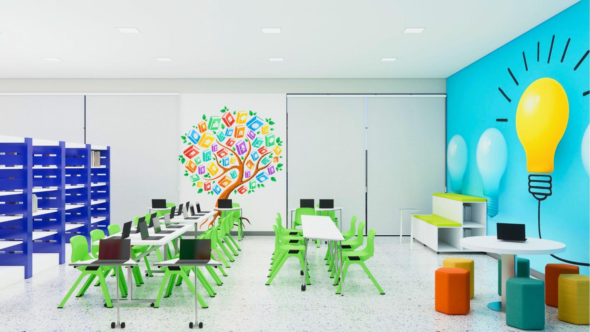 📖 Mobiliário Funcional e Confortável – Mesas, cadeiras e estantes modulares que se adaptam às necessidades do ambiente.