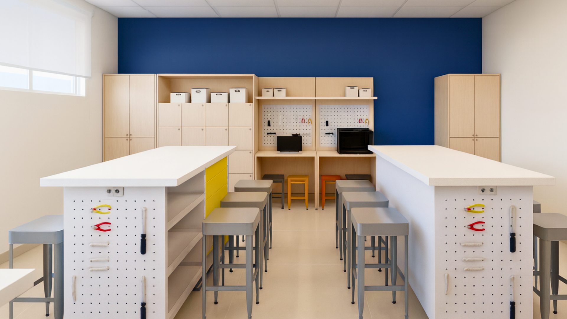 Ambientes preparados para desenho técnico, marcenaria leve, robótica, circuito elétrico e experimentação.
