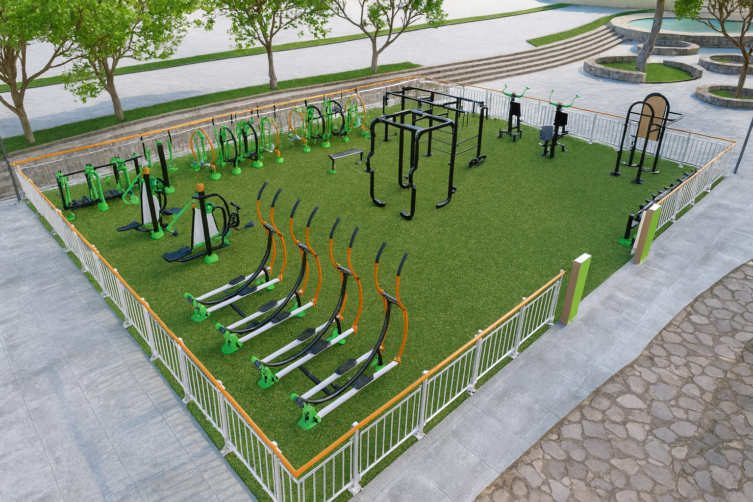 • Academias ao ar livre completas, com simuladores, centrais calistênicas e alongadores